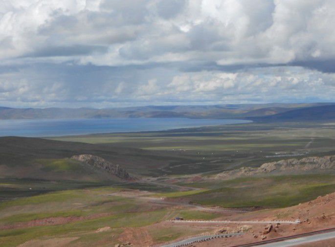 那根拉山口,可以看见蜿蜒的公路尽头出现的纳木错湖的一角。在我们返程的时候天已经晴了,景色十分美,此刻却是风雨交加。