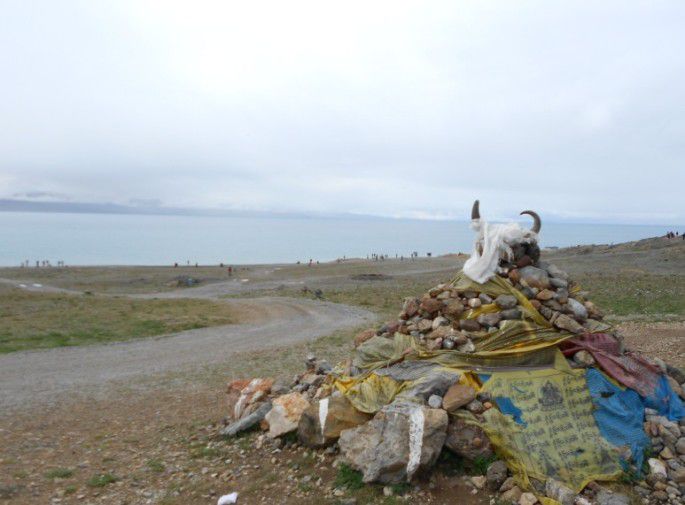 由于阴雨,我们并没有看到明信片当中常见的那个场景,不过也看到了独特的景观。纳木错湖边有个不起眼的小庙,那里供着纳木错女神,我进去参拜了下,对女神说,难得我来一次,至少也让我看下晴天下的纳木错神湖。女神很灵验,渐渐的雨小了,我见到了晴天下的纳木错湖。