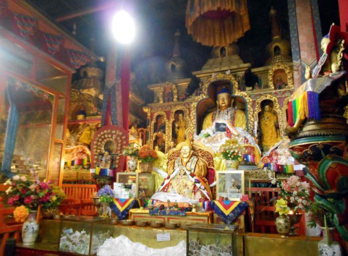 出了主殿,我来到旁边的度母殿,殿内的两个上了年纪的僧人在做专门供佛的食物,叫什么名字我记不住了,看见神圣的度母像,我哭了,原因不明。老喇嘛见我哭了,说了些我不懂的藏文,然后从度母像身上拿下一条黄色的哈达给我寄上,锁上度母殿,又带着我进入了释尊殿,再一次近距离朝拜那尊神圣的觉卧。