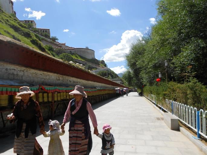 出了布达拉宫,外围宫墙外是长长一条转经路,有许许多多信徒在这里转动一个个转经筒,虔诚的朝拜着。我和北京的哥哥姐姐在布宫外分开了,我走到转经路的尽头,从第一个转经筒开始,顺时针转动起来,转经筒发出咕噜咕噜的声音,此起彼伏,最初被我拨动的转经筒刚刚安静下来,又被后续的信徒拨动起来,咕噜咕噜的声音,真的类似僧人在虔诚的念诵着六字大明咒一般,唵嘛呢叭咪吽!