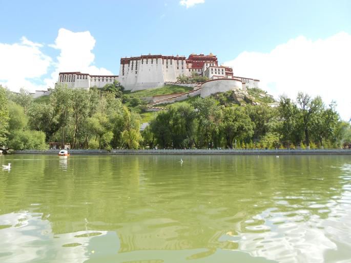 顺着满是经文的路,我来到了布宫身后的宗角禄康公园,这是个免费开放的公园,公园内有美丽的湖,这个湖经常能倒映出完整的布宫身影,湖中心是龙王潭。湖中有着硕大肥美的鱼,悠然自得徜徉湖面的鸭子,还有不时略过水面不知名的水鸟。公园内的树林间,不时能见到飞到枝头的公鸡,似乎一切生物在布宫的笼罩下都可以安然度过一生,这是很多地方的牲畜鱼儿没有的福气!