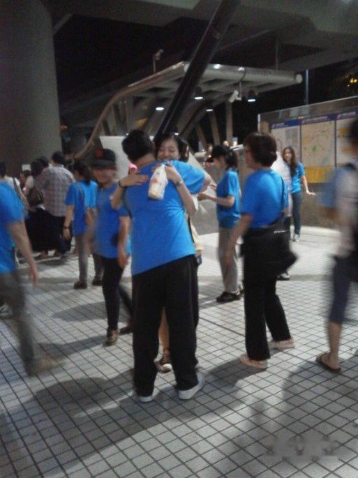 士林车站,义务奉献的人们,给过路的人奉献拥抱; 唉,大热的天,我就免了;
