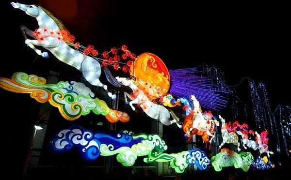 紧随在通道两旁的《红红火火》灯组,充满了浓郁的民俗风情和地方特色,喜气洋洋,红红火火。一路彩灯相伴,跃然眼帘的是纪念塔广场的《群马贺岁》彩灯主景区,在它的旁边,三个唯美灯组《八骏狂奔》《马年吉祥》《平步青云》围绕在主体灯组四周,构成一副万马奔腾、群马贺岁的壮丽景观。