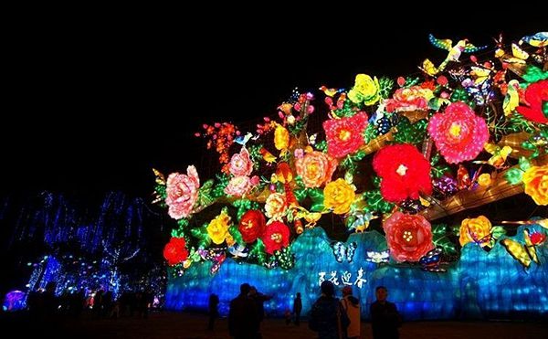 在广场两旁,《百花迎春》灯组直冲云霄,两排30米高的巨型花朵群组成视觉震撼的花的海洋。