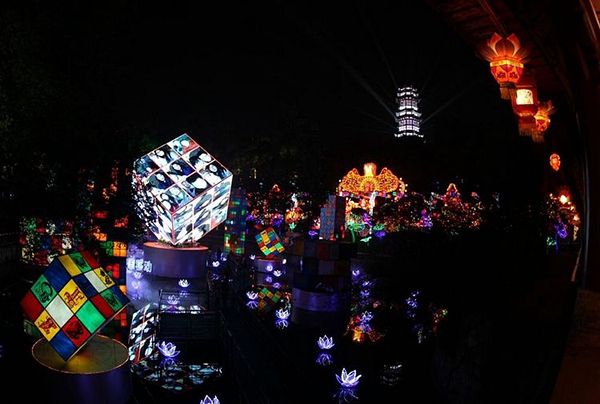 沿三号湖环湖大道继续前行,《幸福魔方》灯组创新的将传统彩灯工艺和多媒体编程技术、科技光源有机结合,将民俗文化、现代科技、时尚元素融为一体,彰显了传统彩灯的张力。