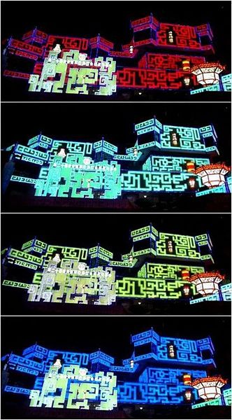 紧随而来的是《幸福笑脸墙》灯组,记录了我市近2000张市民的笑脸。位于石桥上的《跃龙门》灯组以家喻户晓的鲤鱼跃龙门为题材。表现逆流前进,奋发向上的精神。长达23米的鲤鱼,金鳞赤尾,鱼头转动,跃跃欲试。 紧接着的《麒麟献瑞》灯组是灯会传统的精品灯组,是喜庆祥和的象征。一片片金色和银白色的光碟嵌镶的鳞片,金碧辉煌,财气旺盛,寓意家庭和睦、财运茂盛、万事大吉。