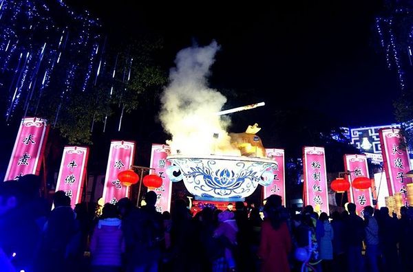 吃在四川,味在自贡。自贡盐帮菜,既是中国饮食文化中的一朵奇葩,又是中国盐文化的组成部分,也是千年盐都风情民俗的重要体现,更是当代川菜系列中的奇葩。步出彩灯博物馆,来到老干馆前,《盐帮美食》灯组用传统彩灯工艺和仿真技术相结合,打造出一道道逼真传神的盐帮菜肴。