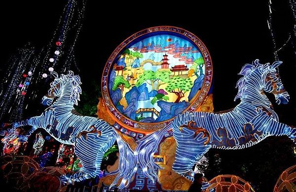 在道生灏彩灯公园大门,璀璨的灯火映照出灯会热闹喜庆的氛围。马年观灯,飞马迎春,巨大的《飞马迎宾》灯组以白色飞马张开翅膀迎接八方来客。