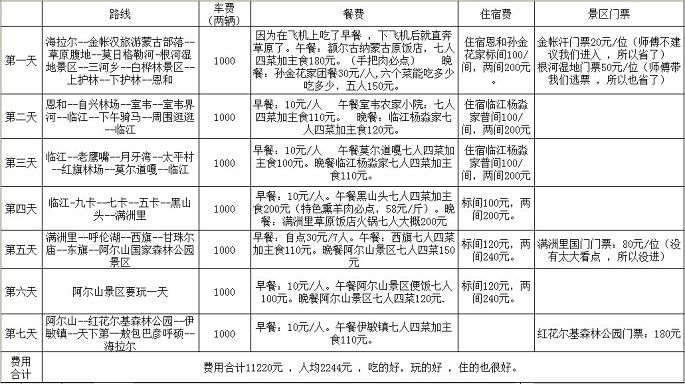 费用篇:下面我列出的费用,不包括我们往返呼伦贝尔的机票,是从我们抵达呼伦贝尔后到再登机离开的七天所有费用,我们一行五个美女 ,包两辆车 ,每台车每天500元,加上两个司机师傅 ,一共是七人。