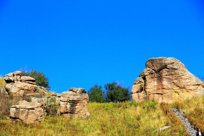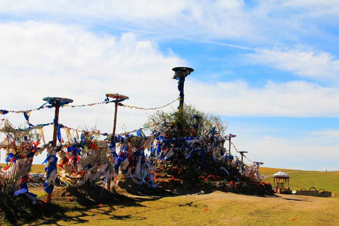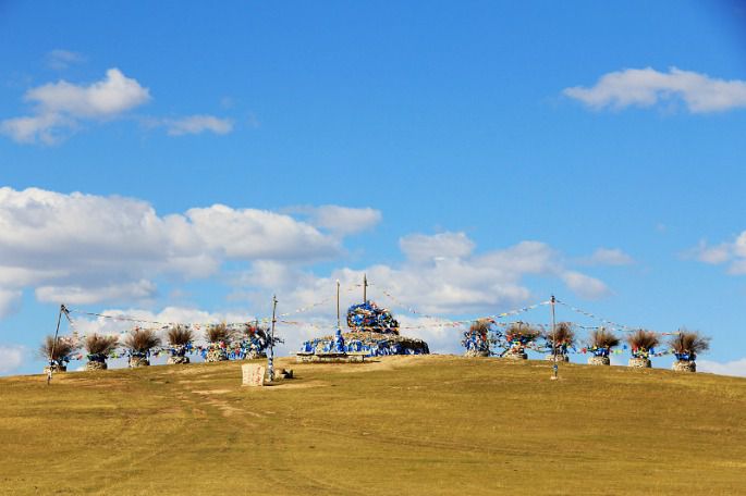 这就是传说中的敖包,司机师傅说,“敖包”是蒙古语的译音,意思是用木头、石头还有土垒成的堆,祭祀敖包,是古老、神奇的蒙古高原上最常见,而且最热闹的祭祀活动。在祭敖包这一祭祀活动中,敖包是祭祀天神、自然神或祖先、英雄人物的祭坛。突然想起了一首歌,《敖包相会》,歌词怎么想也与祭祀联想不到一起呢!