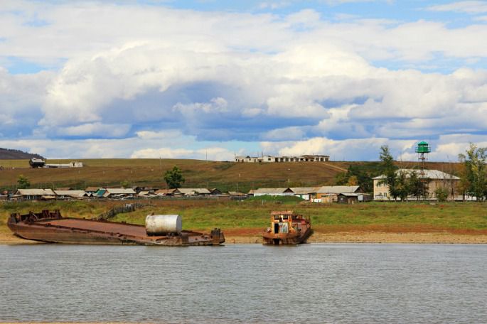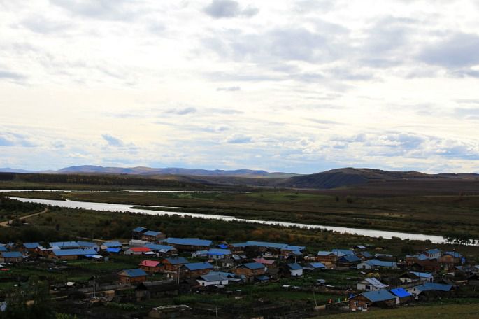 远远流淌的额尔古纳河, 以河中心为界,一边是中国,一边是俄罗斯,隔河相望,对面的就是俄罗斯小镇。