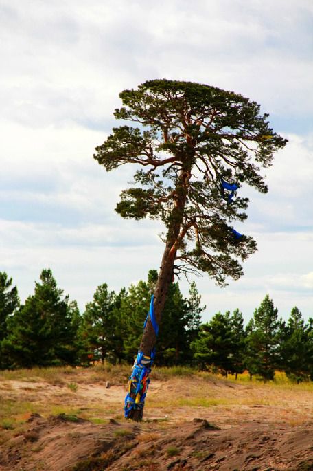 阿尔山路上看见一颗长歪的樟子松,上面缠了很多哈达 ,觉得很有趣,便拍照留影。