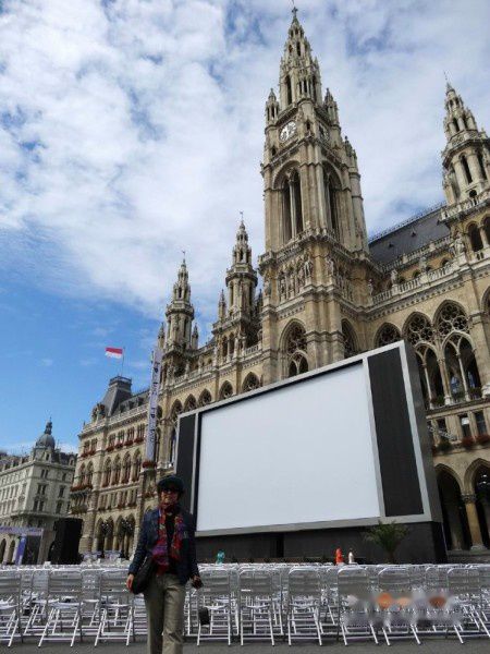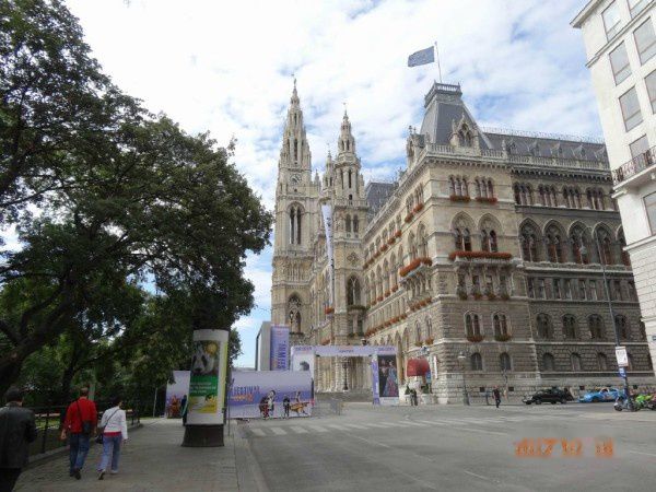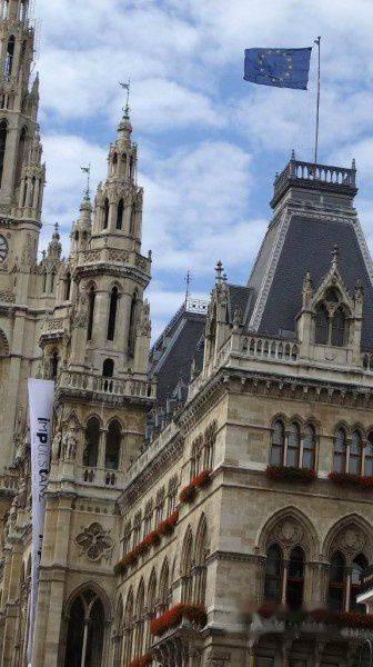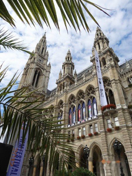 维也纳“市政厅”建于1872年至1873年,弗朗茨约瑟夫一世在众多的优秀建筑师中挑选了德国建筑师施密特来负责设计。这座新哥特式建筑高达99米(旁边的感恩教堂100米),顶部有一尊高达3.4米的“市政厅铁人”。举着一面旗帜的绿色小金人。