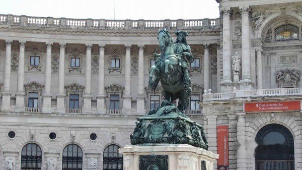 骑马屹立于霍夫堡王宫的新王宫“NeuerBurg”前的奥匈帝国欧登亲王“PrizeEugen”雕像 – 19世纪击溃土耳其的英雄