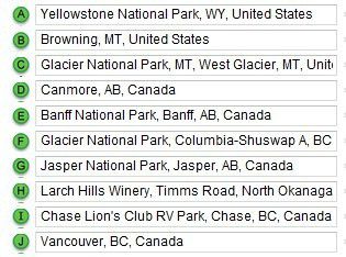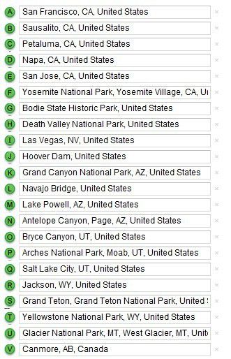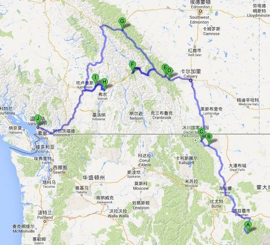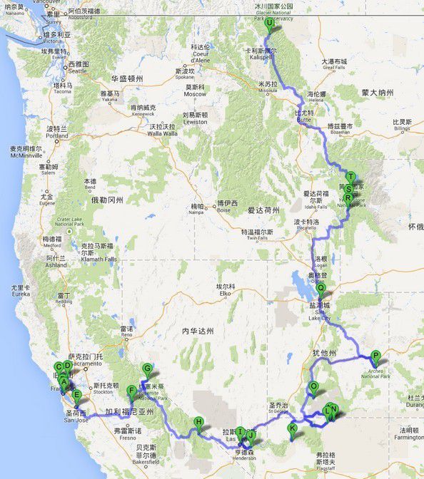 行程:北京——旧金山——索萨利托——佩塔鲁马(Petaluma)——纳帕(Napa)——优胜美地——波迪(Bodie)鬼镇——死亡谷国家公园——拉斯维加斯——密德湖——胡佛水坝——大峡谷国家公园————科罗拉多大桥——马蹄湾——格兰大坝——鲍威尔湖——羚羊峡谷——布莱斯国家公园——拱门国家公园——盐湖城——杰克逊小镇——大提顿国家公园——黄石国家公园——冰川国家公园——卡尔加里——班芙公园——贾斯伯公园——温哥华——西雅图——(安克雷奇)——北京