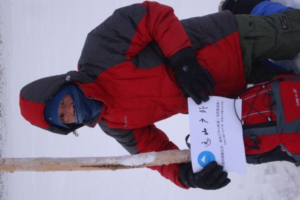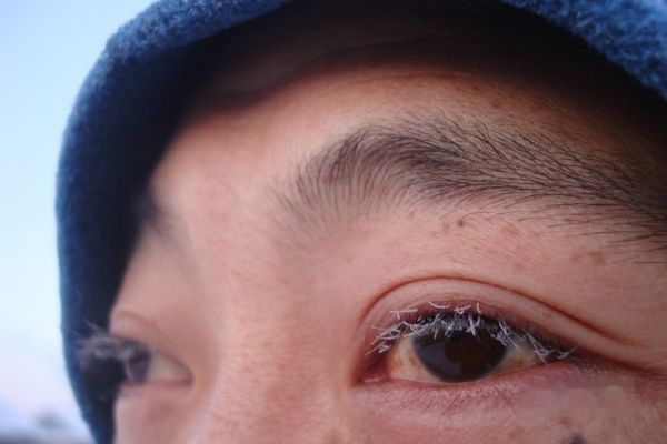 呼气的奇趣,打劫帽是带在防风帽里面的,把整个脸包裹得还比较严实,只有眼睛漏在外面,鼻子和嘴的地方,有夹层的透气孔,只是时间稍长一点,就变得冰冷潮湿起来,觉得很难受。最为特别的是:只要把手捂在口鼻处,呼出的热气不能通过透气孔,就只能向上,不用呼吸几次,眼睫毛上就会挂上晶莹的冰霜,眨眼的时候会有种粘连的感觉,需要不时的揉揉眼帘才能自如的眨眼。拉开面罩,对着里层的抓绒手套呼呼气,凝成的霜马上就将手套从黑色变成白色,十分有趣。从来只听说过滴水成冰,现在却亲身感受了呼气成冰的奇景,的确不枉此行。