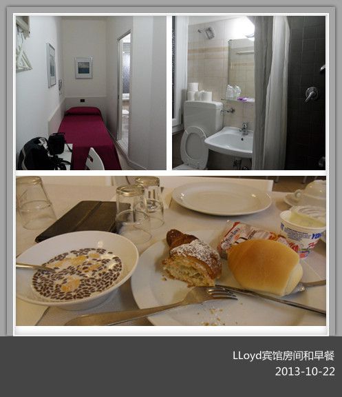 LLoyd是我在意大利订的最贵的宾馆,但是非常值,单人标准间50欧一天,含早餐。不过,其单人间房间非常小,应该是改造过的,宽度只能放下一张单人床。这让想起了我在上海住过的城市经典的单人房。