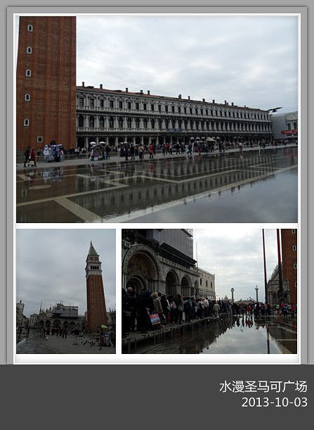 过了这座桥,便来到了威尼斯景点的核心区域---圣马可广场。被称为世界最美的广场,当我来到时,满地是水,也不知这是不是排水系统不好,游客们要踮起脚走路。为了让游客进入圣马可大教堂和四方角楼,当地人搭建了临时的过道。