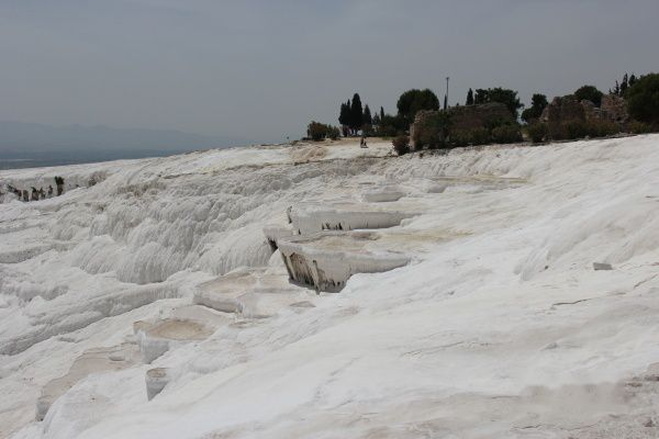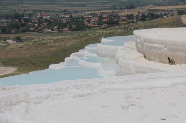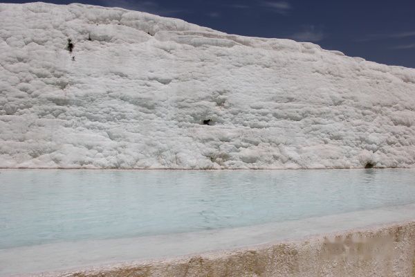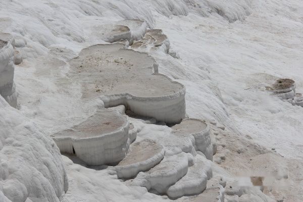 如今棉花堡的部分石灰岩因为受污染,已变成黄色、灰色,雪白的棉花有点像用过的棉花。而修建在附近的温泉酒店,也截取了部分水源,导致棉花堡水量巨减。缺水、变质,成了棉花堡的最大遗憾。棉花堡的泉水深浅不一,有些只没过脚踝,有些可达腰部。