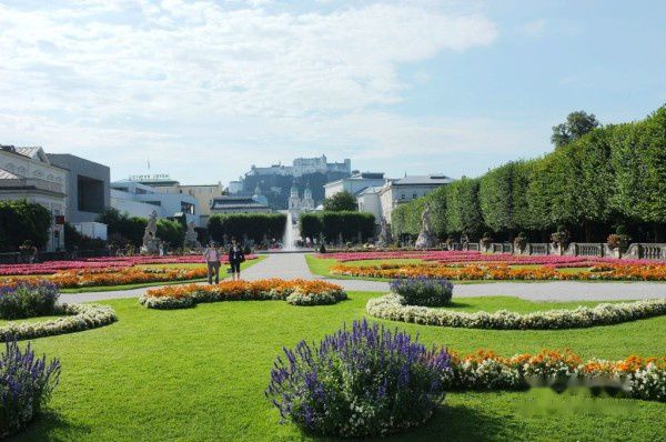 花园跟图片一样,方方正正的大草坪,站在任意角落能远远望到正对的河对面的高高的城堡,很多游人拍照。靠近米拉贝尔宫殿这边,有个高高的平台,爱拍照的人会很认真地在那里找感觉,爱发呆的人可以坐着发呆,闹中取静。远离宫殿的出口出去就是河边了。河面最近的是莫扎特桥,桥面就已非常热闹,在桥上真是风光无限。想游河可以坐桥下码头的游船。我用萨尔茨堡卡可免费坐一趟,有三条路线,有荡一圈返回原地的,我选的是去海伦布尔宫的,因为在城外,所以只供单程,回来得坐公交。坐公交也无妨,一卡在手,畅通无阻。