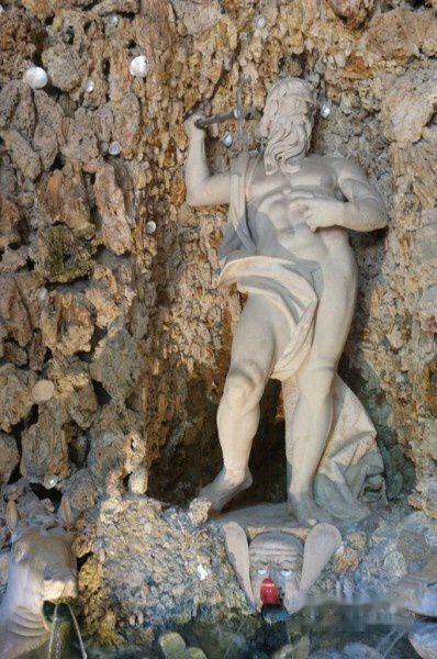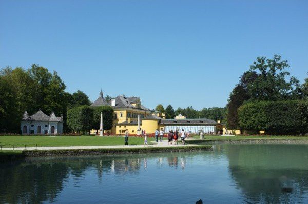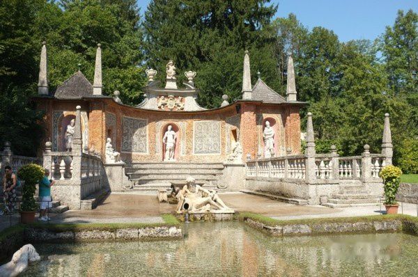 海尔布伦宫Hellbrunn:大概半个小时的游船,就到了城外某处。上岸后,要坐双层观光车大约10分钟就到了。据说是一大主教的夏宫。印象最深的就是trick Fountain戏水喷泉和大草坪。从戏水喷泉的大门分批进去,每批有导游,给大家讲解,跟大家互动,还有启动那些隐蔽的喷水开关。我觉得他挺不容易,真的要很小心,既要让游客玩得开心,又要注意大家手上的相机不被弄湿。令人猝不及防的是第一个游戏,请10个左右的志愿者坐到石凳上,然后跟大家聊天,谁也不知道喷泉会从哪里出来,结果只有一个人幸免。一阵惊慌之后,我们才开始游览。一路上,不管是路边的景观,还是石洞或是建筑物内,只要他带你走过,就冷不防会有水喷出来。一不留神我也被弄湿了,后来我就尽量接近导游,因为他是不会让自己淋湿的。