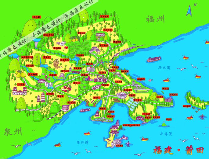 平海康乐设计的手绘地图和百度的卫星地图。莆田市下辖荔城、城厢、秀屿、涵江四区和仙游一县。其中荔城区和城厢区是主城区,有广化寺、南少林、木兰溪;秀屿区有湄洲岛、涵江区有瑞云山、仙游县有仙水洋等名胜古迹和自然风光。这么多景点,该从何玩起呢?我个人会推荐四季精华路线和常规路线供参考。