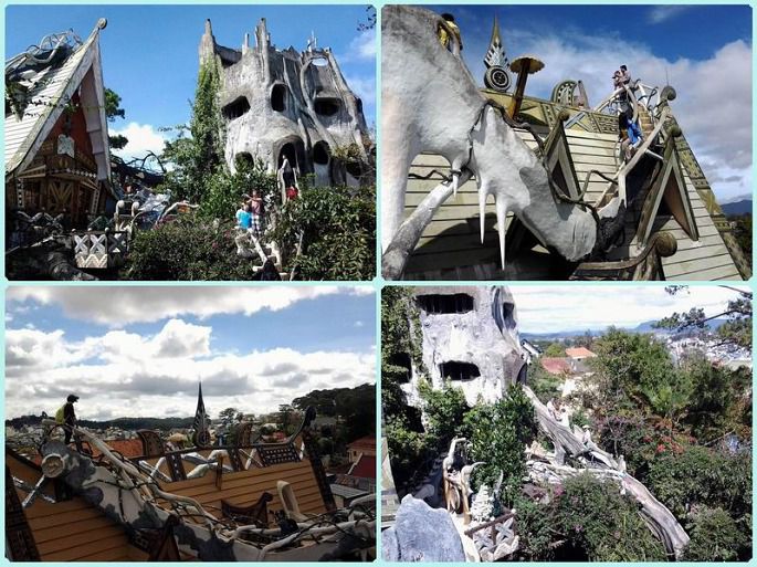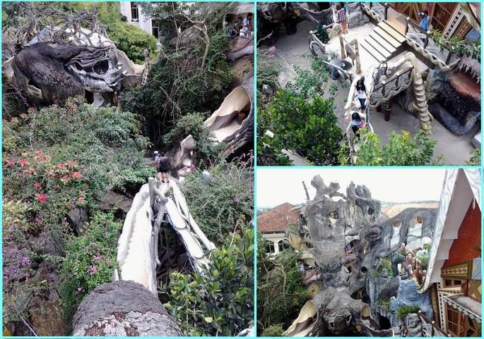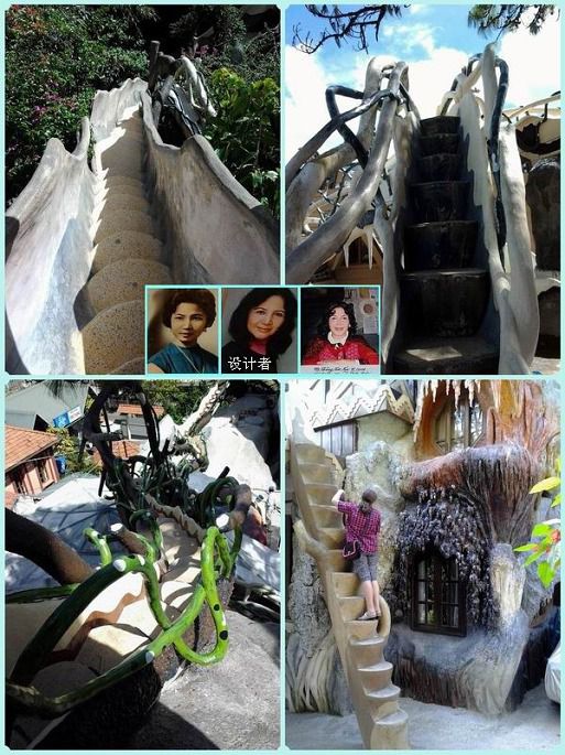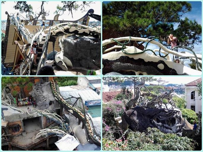 疯狂屋,门票40000盾。本身是一家旅店,有10间屋子,每间都有不同的主题,据说老虎屋是为中国人设计的。同时因为它的奇特而成为大叻的一个旅游景点。设计师是越南前总理的女儿,想象力非常丰富,将各种奇幻的想像变成现实,这一切都有点森林童话的味道。这幢建筑将颠覆你所有关于房屋的概念。小小房间以动物命名,巨大的蜘蛛网、蜜蜂巢、弯弯曲曲的楼梯,人们爬上爬下,直呼过瘾。至今建筑还没完工。一进门的左手屋子有设计者及家人的介绍,有各地报刊对此地的报道,可惜我拍的这部分照片毁了。另外,那个最高屋顶我也不敢上去。不过,屋内另一个制高点(正在施工),在上面欣赏大叻景色很是不错。