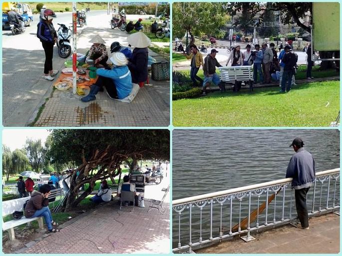 大叻的房子五颜六色,很多老房子保存的很好;遇到一个穿奥黛的妇女,急急上前拍照却没拍下脚;大叻的小吃满街都是,小小市场也在街边;镜头对准可爱的小女孩,她正拉着哥哥要他来看我;街心花园里,剧组在拍电视剧,第一次看到演员的现场表演,喜怒哀乐换着脸,觉得很有趣;下午回到春香湖,湖边有人用网捞鱼,走近看看,嗯,收获还不少;往前走又看到湖边的“加油站”,呵呵,这就是越南的特色。