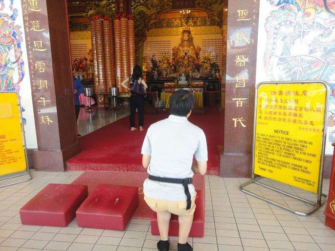 吉隆坡天后宫是东南亚最大的天后宫之一。里面供奉的是妈祖。每道门两边都贴着汉语对联。身在异乡,却有家的感觉。东南亚一带的华人先辈大都是乘船飘过来的,下南洋的途中妈祖就是船员们的精神依托,类似于“上帝保佑我们”。他们后代在当地“生根发芽”,但骨子里流淌着的传统文化血液比当下大多国人还要纯正。他们有信仰,我们信仰谁?