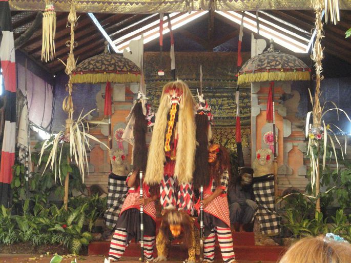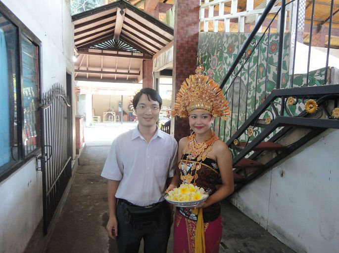 出发不久,司机建议我们去参观一个寺庙,那里有巴厘传统的剧目表演。一进门,迎接我们的是鲜花,还有几位巴里美女。