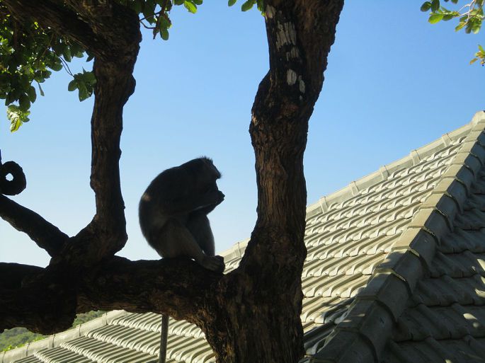 可惜当年的孙大圣不懂爱情,如今的猴子徒孙也不解风情。一只小猴子一跃上一位美女的肩上,一把扯下她的发夹,飞似的跳上一个树丫,又撕又咬,穷尽挑衅。偏偏那个美女不爱香蕉,眼睁睁看着自己心爱的发夹惨遭蹂躏。