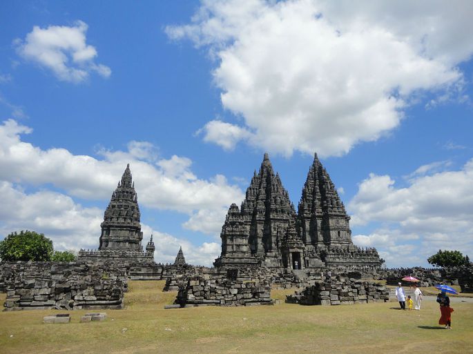 Prambanam普兰巴南——世界文化遗产。它离婆罗浮屠不远,风格迥异。 普兰班南神庙群位于日惹以东,建于10世纪,是现今印度尼西亚境内最大、最美丽的印度教庙宇,是记录印度尼西亚人祖先灿烂文化的载体。普兰巴南寺庙群由240座庙宇组成,大部分已经沦为一堆瓦砾,但一些主要的庙宇在经历了天灾人祸的沧桑变迁后,在人们的努力下得以重建,又焕发出昔日的风采。普兰巴南寺庙共有8个圣殿,其中三个主殿分别祭祀着湿婆、毗湿奴和罗摩这三位印度教中的主神。中心院落里有三个主殿。湿婆殿高为46.5米,里面是湿婆的妻子杜尔加的神像,也是最高的神殿。湿婆殿的北侧是维斯奴庙,南侧是婆罗吸摩庙,前面是楠迪庙。在毗湿奴和婆罗吸摩庙的前面是瓦哈诺庙,阿皮特庙位于北侧,其南侧与庙宇相接。在主广场每一个大门前面的东西两侧有四个克利尔庙;而在主广场的四个角上均各有一个小庙宇。普兰巴南寺庙群的创建基本上是模仿了神话中描述的众神居住的马哈穆罗山,因此各种雕刻和装潢都是按照神仙境界模样完成的。