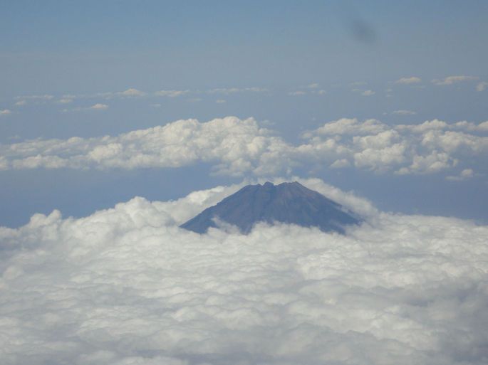 俯瞰默拉皮火山(Merapi Mount/Gunung Merapi,2,911m)。它沉睡的时候,最为柔美;愤怒的时候,足以摧毁一切。它是印尼最美也是最猛烈的活火山。在市区就可以远远看到它的雄姿,就飞机起飞的那一刻,我不经意间瞥见它最为柔美的一面,我冒险拍下了这张照片。