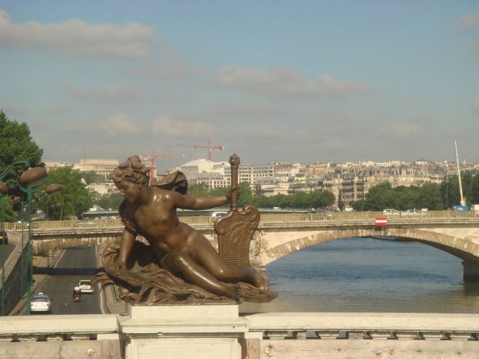 塞纳河上架着的桥,据说共有36座,每座桥的造型都有特点,而其中最壮观最金碧辉煌的是亚历山大三世桥了。这座桥以其独一无二的钢结构桥拱,将香榭丽舍大街和荣军院广场连接起来。建此桥为庆祝俄国与法国的结盟,当时是1900年前后,俄法两国在百年前还是世仇,拿破仑曾挥师攻打俄国,使莫斯科烈火屠城。100年后两国一笑泯恩仇,而且意味深长地将桥通向拿破仑墓。大桥两端四只桥头柱上镀金的雕像,由长着翅膀的小爱神托着,它的华丽造型和色彩在巴黎特别显眼。