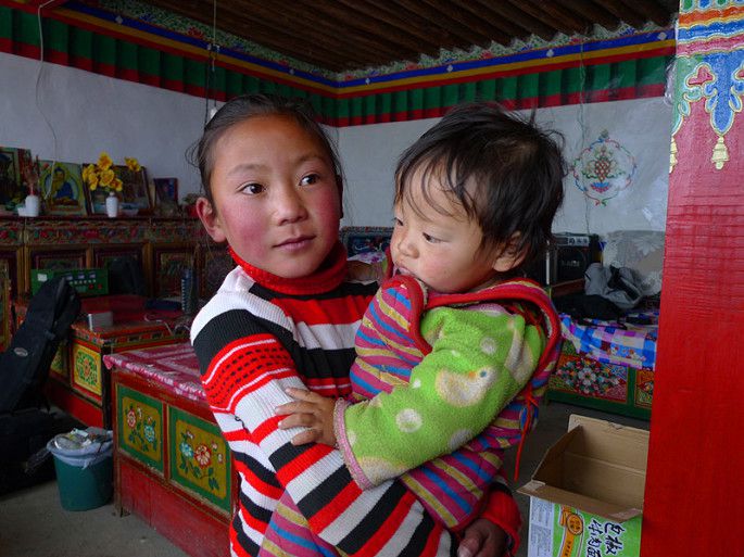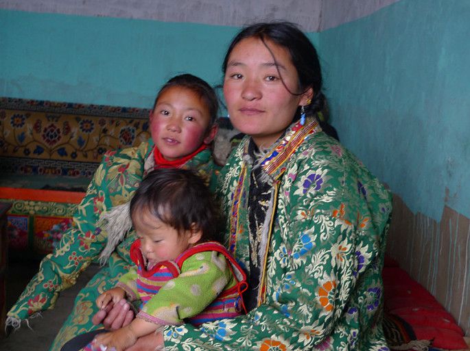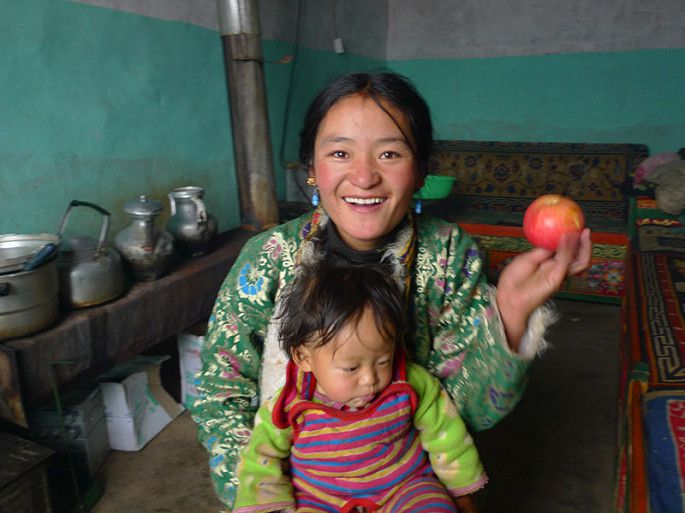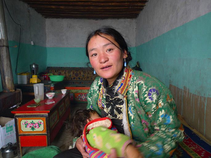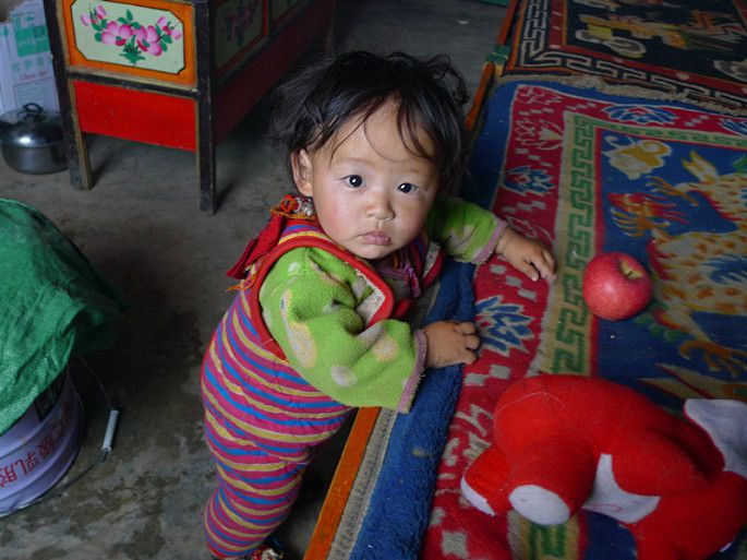 年轻的藏族妈妈有一男一女两个小孩,对于我们的到来很热情,她摸摸我的手,感觉很凉,便拉着我进她的屋里去烤火。真是一方水土养一方人,他们穿得并不多,但他们的手是暖和的,看到年轻妈妈时不时把小的那个抱出屋外,我联想到我N多年前带小孩的情景,换了我,根本不敢把小孩子放到这么冷的地方。虽然我们语言不通,很难交流,但是能感觉到彼此的善良。