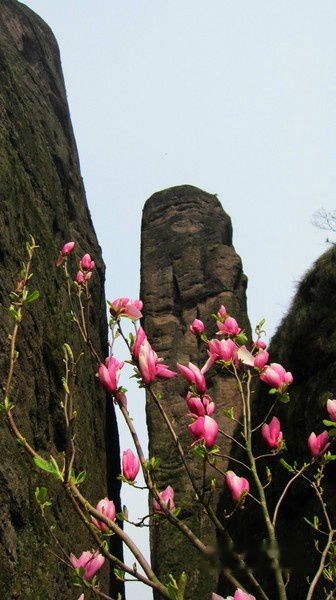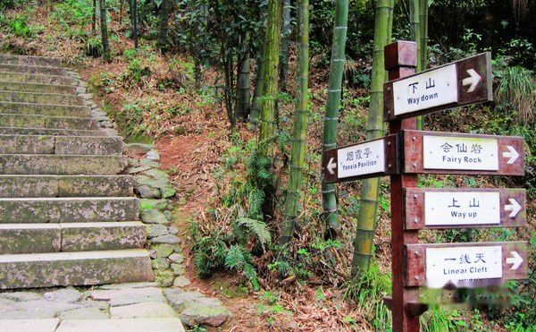 4月2日。晴。又是一个好天气。吃罢早饭,把重的东西放在客栈(我最高兴,爬山背不动啊!)8点从山脚下坐景区的车上了山,开了大约10分钟的盘山路 到了售票处,买了联票(江郎山+廿八都镇),后来的旅途证明这个联票买的是失误的。继续盘山路坐车,8点半到了开明禅寺,下车。开始了正式的江郎山之旅。 借鉴别人的攻略,我们也选择了从右边走会仙岩--一线天--郎峰绝顶这条线。一路上没有什么游客,很有点“清晨入古寺,初日照高林”的意境。山里有着各种不认识的树木,上面都挂着牌子写上树名和用途方便游客观赏,又增长了不少见识!在一线天休息时等到了蝎子同学,我们的队伍又壮大了。