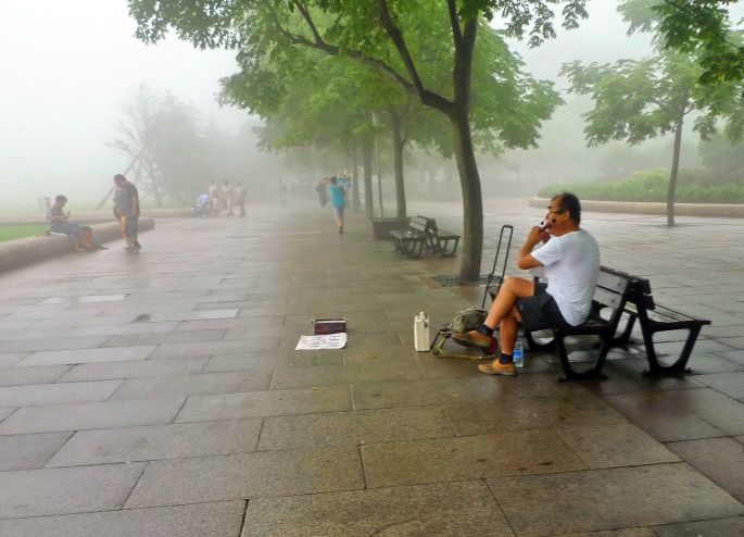 远远地看到了一个中年男人坐在雾中湿漉漉的座椅上,专注滴吹着,眼前摆放了一张字条:夫妻双双下岗,为了孩子上学,希望路人帮助。顿时心情一落千丈,美丽的城市,优美的乐曲,结果是无奈的求助。我悄悄地拍了一张照片,没有单独走近,也没有留下钱,我和同学们一起继续浏览青岛的雾景。