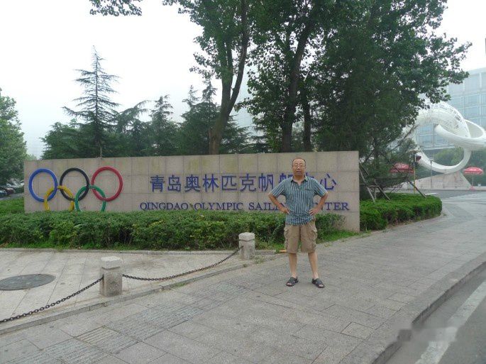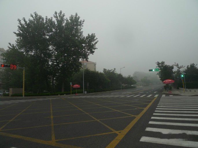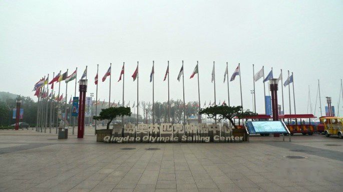 浓雾中跨过一个十字路口,一直往前,五六点的光景,马路上人很少,想问个路都非常难。一直往前走,终于过了三个路口以后,看到青岛奥林匹克帆船中心和五环的标识,跨过路口,一个漫步在清洁的马路上,静静地享受这份美丽。