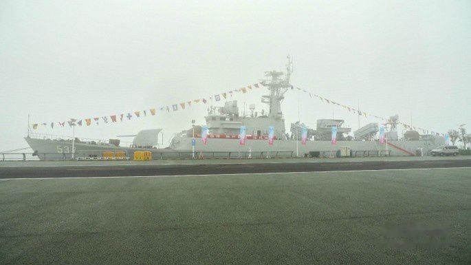 这时候我想起了苏小明的成名曲《军港之夜》,尽管此时已经是雾蒙蒙的早晨。军舰旁边好几个海边垂钓的老人,也成了晨雾中的一道风景。