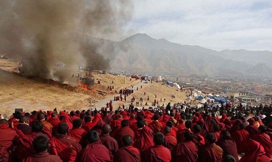 火葬:火葬的地位在历史上仅次于塔葬,同样只限于活佛和有名望的大喇嘛,但现在已逐渐趋于一般化。先由几位长者将尸体擦洗干净,用麻绳捆成人出生时的蹲坐姿式,五官中塞入酥油,然后装入木制棺匣中。焚烧时要先用泥石砌一宝瓶样式的炉子,将松柏木柴置于其内,再浇上清油或酥油等易燃物,然后再把“桥子”安放在宝瓶炉上,请来喇嘛一边诵经超度死者灵魂,一边燃火焚烧。将尸体火化后即将宝瓶炉拆除,收集起骨灰后一般都撒到江河里或者高山之上,也有埋入土中的。而如果火化的是寺院中有名的喇嘛,其骨灰被收集后,一般都会建塔保存。