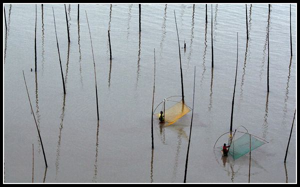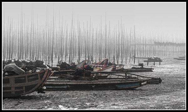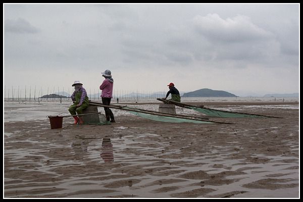 走进泥泞的滩涂,俯身观看平滑沙面上的大片“沙画”,或似含苞待放的秋菊,或似奇葩异卉的花草,规整而流畅的线条犹如娴熟的白描。正诧异出自于何人之手,却见沙面冒泡,无数不知名的虫蟹钻出,忙忙碌碌地旋转、爬行,随即消失,平滑的沙面顿时妙笔生花。正全神贯注于虫蟹作画,忽听有人高声对我嚷嚷:“嗨,离开,我们正在演出呢”,“你已经被入镜了,没看见那边正在拍摄吗?”,回头望去,远处山坡上一群手持长枪短炮的摄影团队正对准这里,原来这是当地所谓的特约模特。专业的用词、专业的道具、男女搭配,以及他们的“捕捞、赶海、涉水、望归”等等的小品动作,还真像敬业的演员。那具有霓彩的渔网和胶靴、那停泊在泥泞中船身上的斑斓色块,无疑为这场景抹上了一层亮丽,让摄影者的作品生动起来。