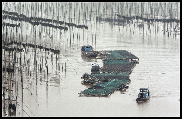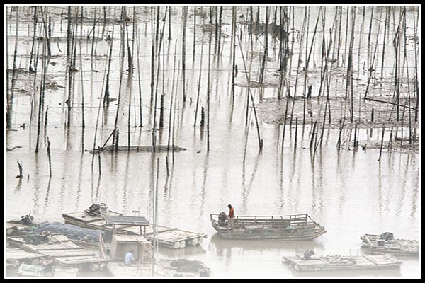 在霞浦短暂的居留期间,基本都是阴天细雨,所以没能赶上日出燃烧天际的壮观,也没能领略落日冲破云层,撒向滩涂的瑰丽,更没能看到夕照下,蓝色的海面变幻着的亮金、浅黄、青绿、橘红的神奇,可以想象那该是多么五彩斑斓的景象。但是在阴霾的天空下,我看到了诗意的朦胧和淡泊的宁静,如同进入了一个水墨画的意境,芟繁就简,看到的是真实浑厚的山体和洁净的水面,突发着一种傲视流俗之感,顿觉内心格外地素净。远处不时地驶过一艘船只,在如银箔镜般的海面上无声地划开了长长的痕迹和经久不逝的涟漪。