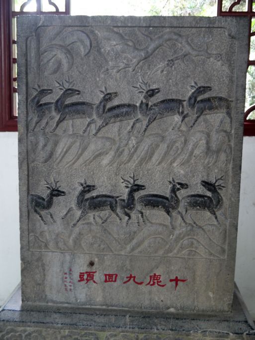 园分内外,外园乃于旧园以西扩建而成,方圆倍之,树木葱茸,亭阁寥寥。园中有池,满池白荷, 阵风掠过,若婆娑醉舞。向东经雪海堂入旧园,此为园之西首,原先的大门开在东头。雪海堂在换旧瓦,无由入内,堂前凿一方池,水涸无鱼。堂东一门通内,联曰:“竹送清溪月,松送古谷风”,乃集董其昌句而成。绕出门庭则一池居园之中,池内亦植荷,四围轩榭团绕,以朱廊连缀一体,水脉经北面的池上草堂而出,于园北亦漫作一池。一园之眼在池上草堂,歇山单檐而檐角飞翘,朱漆柱廊、冰梅纹窗,四合通透,西首为花墙略遮,而堂下凿空引池水北向,虽体量非小,却具灵动之势,悬之以云间宿耆程十发书“醉白池”匾,诚文气郁郁,逸兴湍发。堂前有百岁牡丹一畦,惜非花时。园北有乐天轩,乃谷阳园“文澜堂”旧迹,又有张弼之“廉石”,颇讽世风。循朱廊向东,乃主人居停之宝成楼,绕之向南,则廊壁上嵌石累累,一为水精宫道人赵孟頫行草前后赤壁赋,遒媚秀逸,纷彩灿然,诚书家之圭臬;又一为清人徐璋所绘《云间邦彦像》,凡廿八幅九十一人,一像一赞,董文敏、徐文定、陈大樽、夏瑗公父子皆在其列,赞辞简而有征。如此嘉誉邦彦者,尚在如皋水绘园中见过。园之南区有土阜碧潭,雪梅亭、听鹤榭点缀上下,皆有回廊相通,一碑置廊中,曰“十鹿九回头”,碑上十鹿奔走,九首北向,清嘉庆松江府志曰:“以作事不全者,谓之十鹿九回头”,此碑本普照寺前石桥之栏板,桥毁而迁“云间第一楼”,楼倾再迁醉白池,松江人诚爱之甚也。园林隙处以树桩盆景实之,曩时不以为然,但觉造作,近稍改观,缩丈成尺,衬以粉墙,亦中国式审美之一种。
