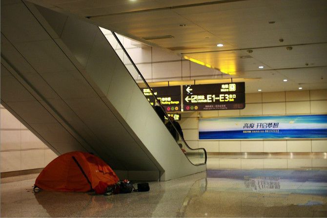 这一夜,在白云机场某个电梯下面扎营住宿,幸好没被保安驱赶。人民币就这么省下来了。