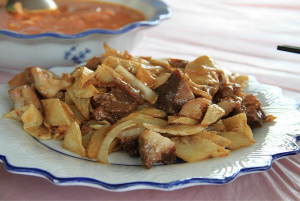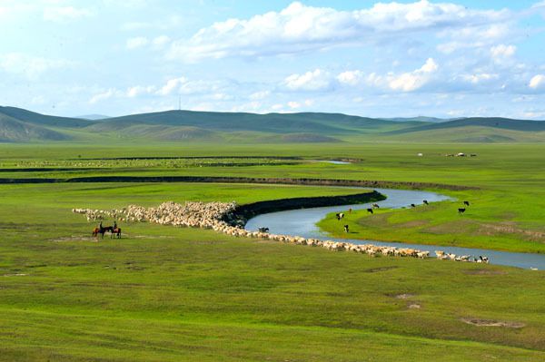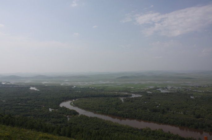 领队把车停在金帐汗的前面,金帐汗不打算去了附近 的草地还是可以玩一玩的。辽阔的草原,在草地上跑来跑去,捉了不少蚂蚱。看到远处的牛羊,我们一行人就像饥饿的人扑到面包上一样想赶过去,领队说以后见到 牛羊的机会多的是,路边到处都有,没有必要跑那么远去看,我们才止住了脚步。草原上的草和我们想象的不一样,并不高,“风吹草低见牛羊”是不可能了,勉强 够得上“浅草才能没马蹄”。草虽然不高,但十分齐整,象割草机割过一样。草的颜色纯正,远远看去,一片毛茸茸的浅绿,而且片大,从路边一直铺到遥远的小山坡上,除了路面,不留一丝空地,这满眼的绿,给我们这些第一次到草原来的人的视觉冲击也是蛮大的。领队说侧面那个围场里也能看到莫日格勒河,果然,一条弯弯曲曲的河呈现在眼前。可我们离开金帐汗,赴额尔古纳市午餐,一路上草原如影相随。一路上我们的好奇心沾满了我们整个心,心中的问题也太多多太多,我们与领队相处的非常好,他很亲切、和蔼、对于我们所有的问题都是领队一一回答的。一路看着风景、聊着天,时间仿佛过的好快我们一家五人来到了额尔古纳市到那已经中午领队给我们介绍了额尔古纳特色烤羊排、野菜丸子、东北的锅包肉、占酱菜(可是自己家种的菜噢~~~)、菌汤、丰盛的午餐开始。