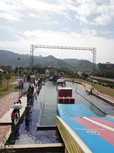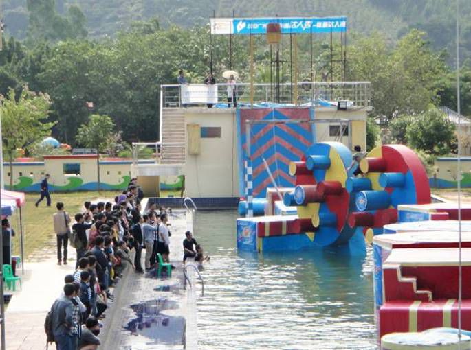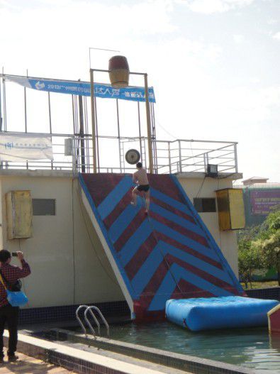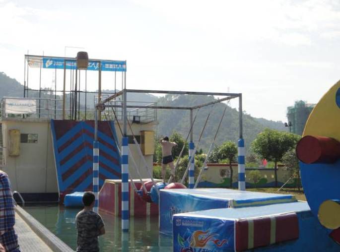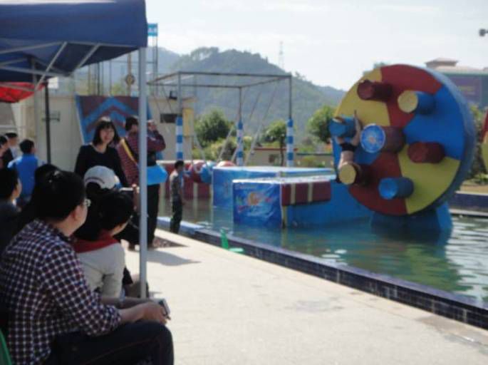 不一会儿,比赛就开始啦,第一个同事平时瘦巴巴,想不到冲关起来,一下子就窜到第四关口,不过很不幸,再拍摄完这张照片之后,就光荣落水了。