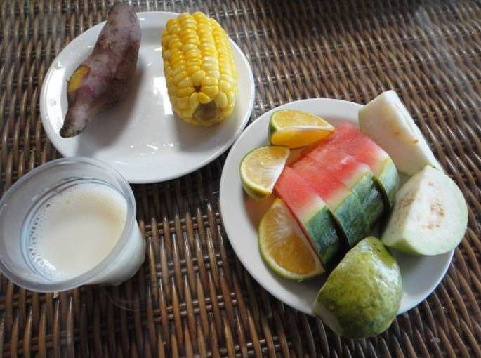 泡完暖暖的温泉,最后是素食的美味,西瓜、石榴、玉米很甜,番薯很粉,豆浆是大观园自打的,有一股机器味道,不推荐,后面喝的罗汉果茶味道不错。