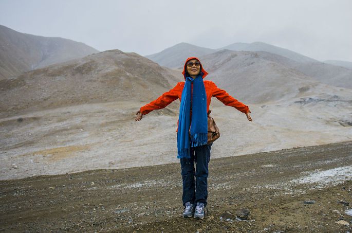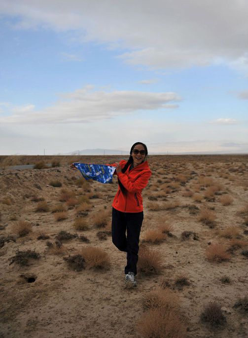 沿途经过一段荒芜的戈壁滩,司机停车让大家方便,我乘机摘下咱们天下民宿赠送的标志性头巾秀了一把。嗨嗨!