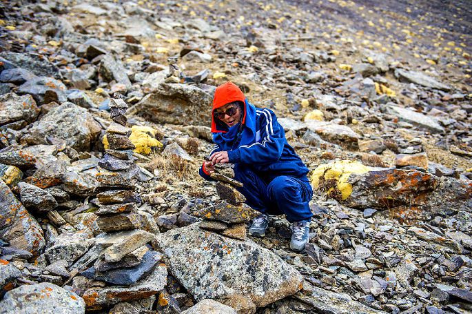 走到这里,看到许多用石头垒砌起来的玛尼堆,很有意思!我也想在这垒砌一个。由于亚父的催促,我只能匆匆垒起了一个8层的玛尼堆,比起旁边那座18层的,实在是太逊色了。呵呵!