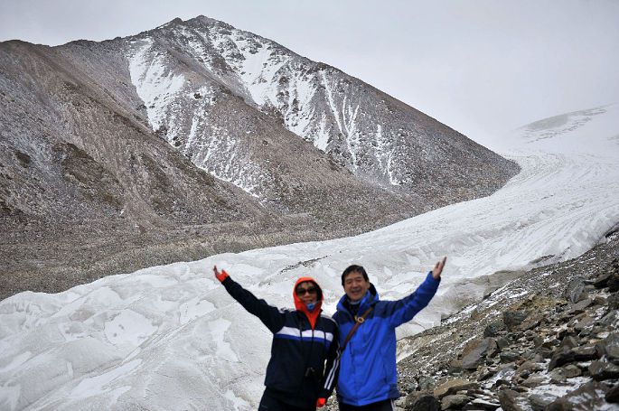 快到景区大门,美女司机开始有高原反应了,没料到车子也被她传染发动不起来了。我们只好下车步行到门口,买了票向冰川挺进!经验丰富的亚父拿出了他的冲锋衣让我穿上,嘱咐我:上面气温很低会冻着的。我接过穿上,顿感温暖,倍受感动!